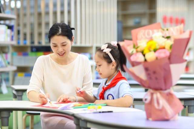 在江苏省泰州市姜堰区实验小学教育集团北街北校区,老师带领学生绘制贺卡。通讯员 周社根 摄
