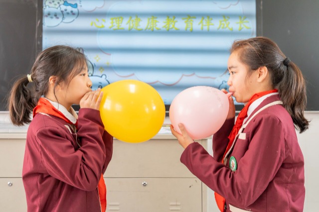 学生们在吹“减压气球”。通讯员 翟伟凯 摄
