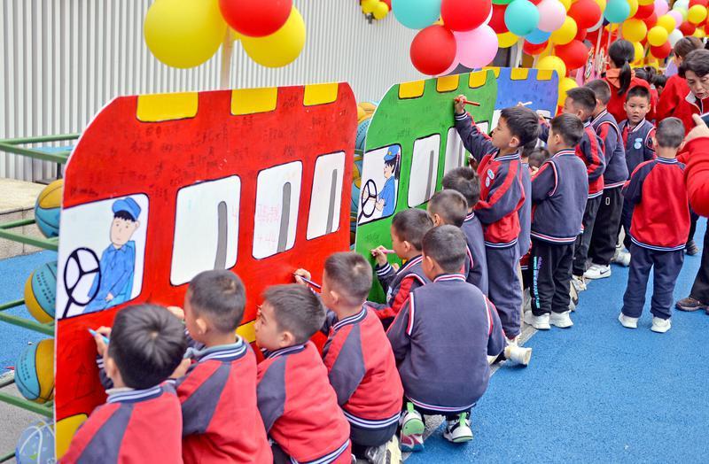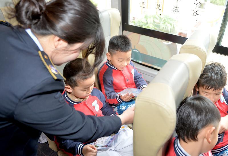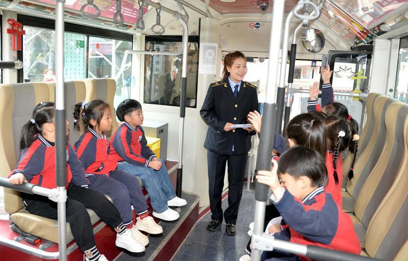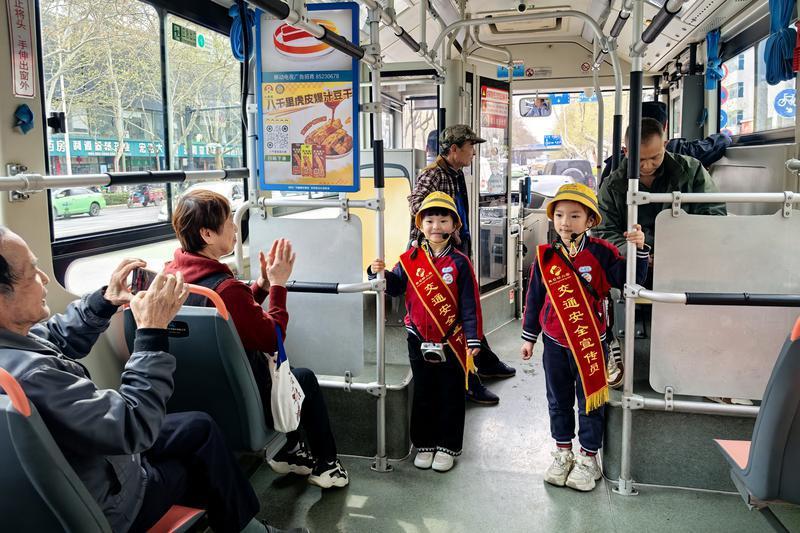 当天下午,8名大班幼儿在老师和家长的带领下,化身“小小交通安全宣传员”,从43路公交调度站出发,两人一组分别登上4辆公交车。“请大家扶稳坐好,不要在车厢里随意走动、大声喧哗,要主动给老年人、抱小孩的乘客让座……”孩子们用稚嫩的声音宣讲安全、文明乘车知识,赢来阵阵热烈的掌声。